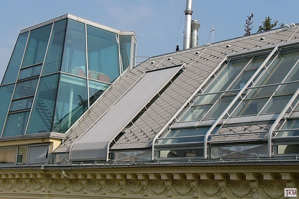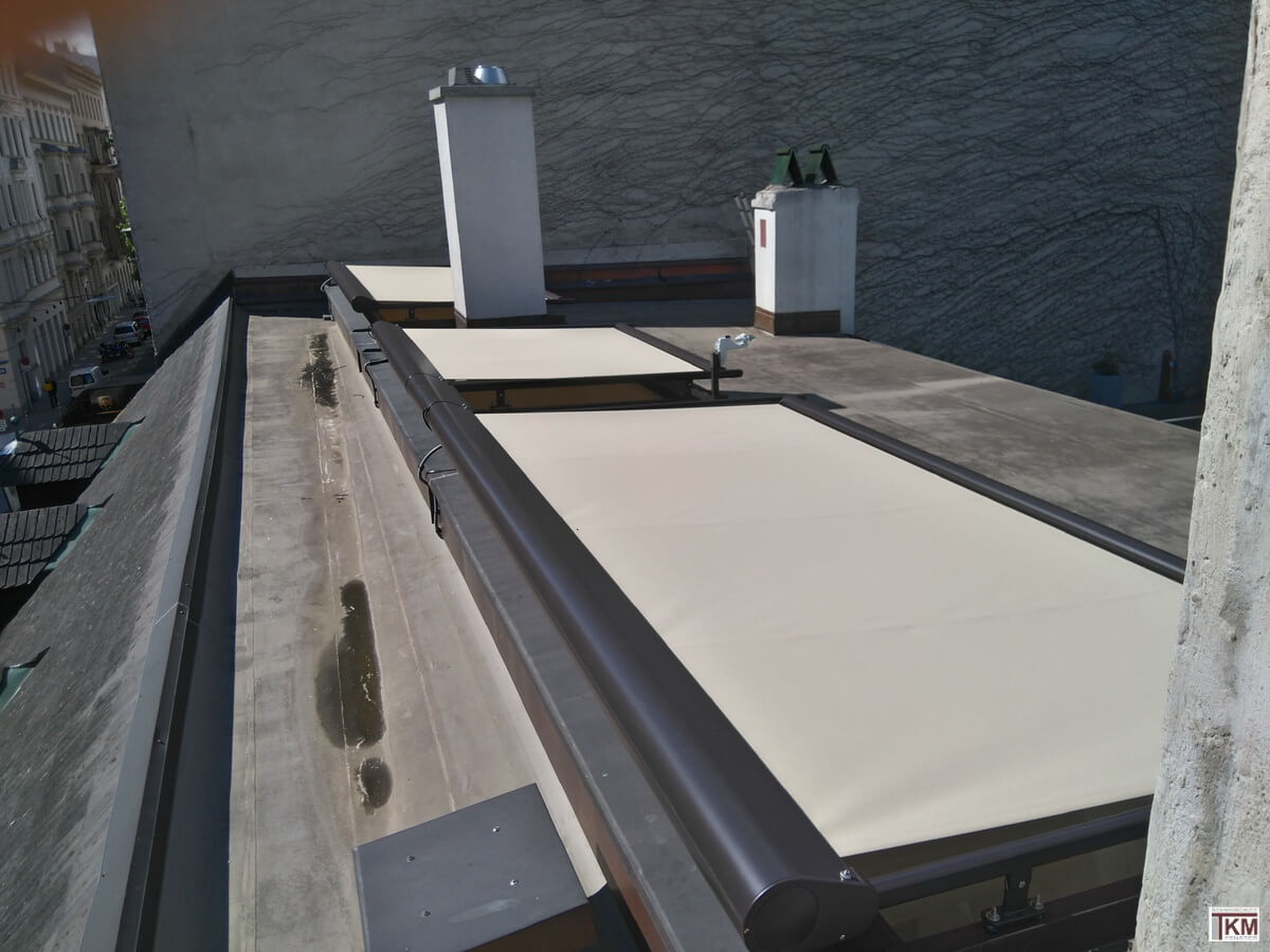 Einzel- oder gekoppelte Beschattungsanlagen für AUSSEN ermöglichen hohen Wärme- und UV-Lichtschutz für große Flächen und werden grundsätzlich auf den Rahmen der vorhanden Dachverglasung mittels Konsolen montiert und garantieren einen außerordentlichen Komfort durch einen eingebauten Elektroantrieb. Sonderausführungen der Dachbeschattungen, wie Dreiecks- oder Trapezanlagen stellen eine individuelle Lösung auch für scheinbar schwer lösbare Formen dar.