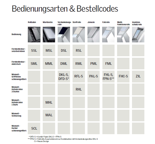 VELUX Sonnenschutz - Bedienungsarten - Bestellcodes